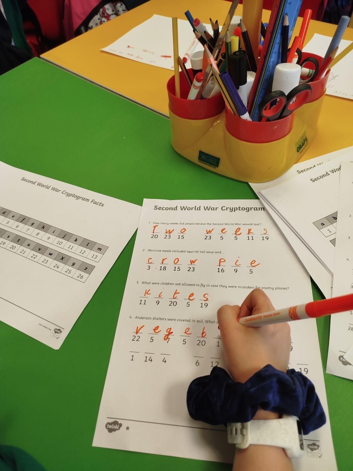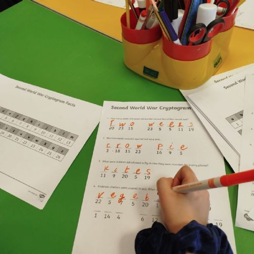 The Yr4 children enjoyed learning all about World War 2 through Activity Based Learning. They took part in a variety of activities including finger knitting, code cracking, role play, maps and soldiers and research using the iPads.